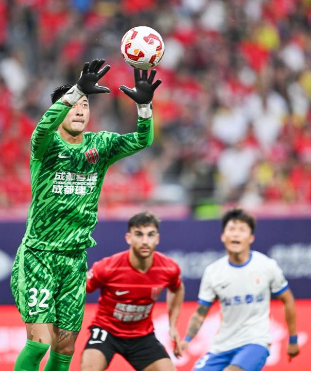 ↑2025年8月2日,成都蓉城队守门员刘殿座(左)在中超第19轮比赛中扑救。新华社发(尹钢 摄)这位35岁门将
